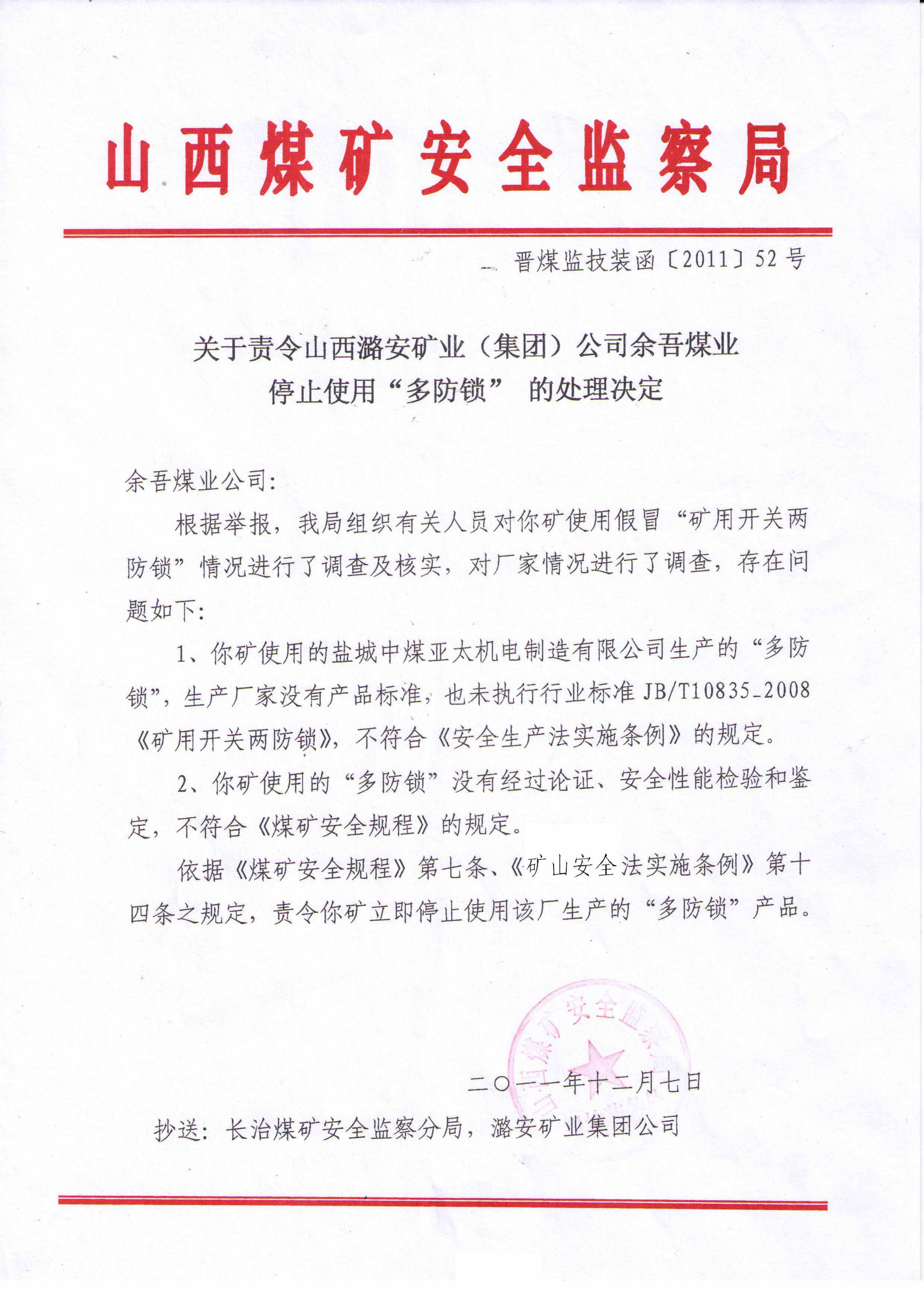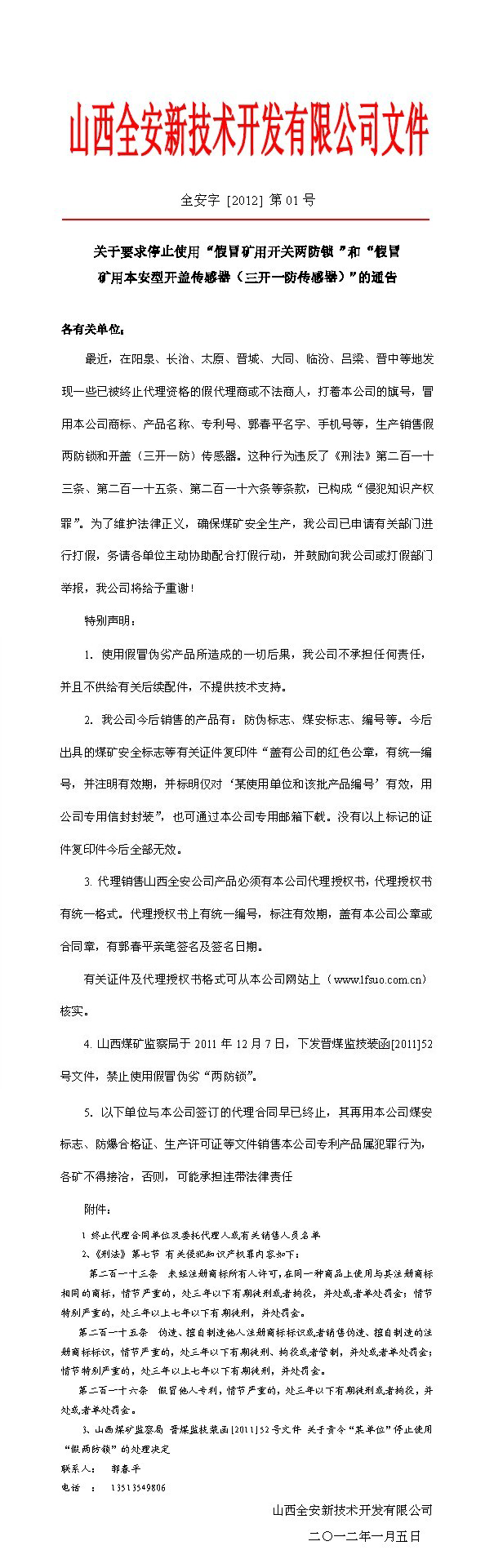 关于要求停止使用“假冒矿用开关两防锁”和“假冒矿用本安型开盖传感器(三开一防传感器)”的通告