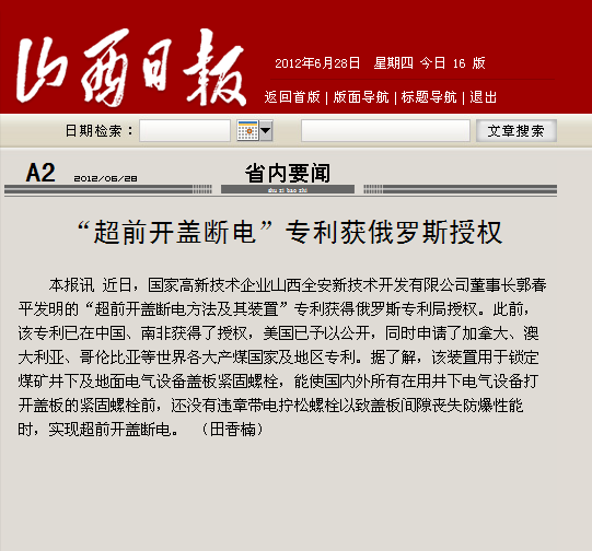 山西日报:“超前开盖断电”专利获俄罗斯授权
