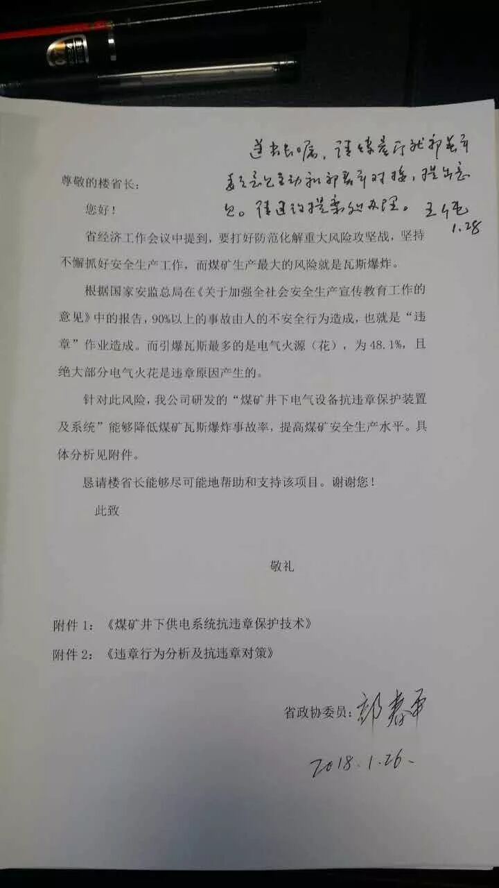 楼阳生省长对山西全安公司自主研发的智能“抗违章保护技术”的批示
