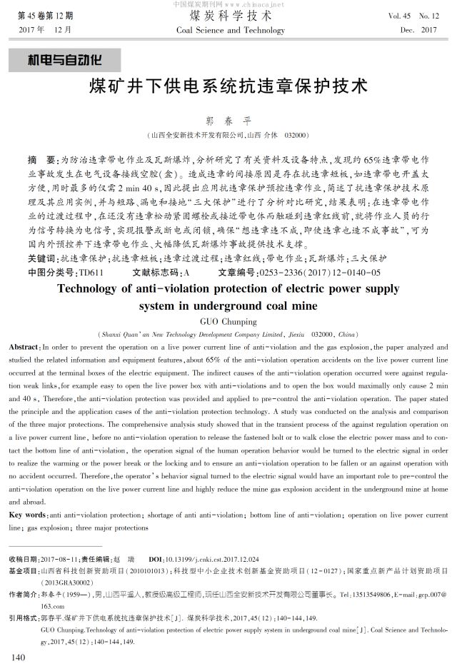 引言:违章作业已成为煤矿的第六大灾害,经分析文献可知,违章作业可造成90%~95%的电气火源(花),引发43.29%~45.7%的瓦斯爆炸。研究并预控违章带电作业对降低事故率,提高安全管理水平,具有极其重要的意义。用间接原因致违章观点,分析研究违章带电作业的间接原因,可发现在用井下供电系统确实存在抗违章短板。通过分析研究抗违章保护技术原理及应用实例,并与短路、漏电和接地“三大保护”进行对比,可以确定,抗违章保护是防治违章带电作业及瓦斯爆炸的有效新技术,目前还未检索到其他有关报道。在违章过渡过程中,还没有触碰到“违章红线”前,就将作业人员的行为信号转换为电信号,进行违章预控的思路,与打人海战预防违章作业相比,具有实质性进步,对各行各业安全监管和安全预控意义重大,对我国今后安全发展战略制定有重要参考价值。